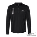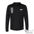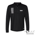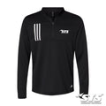 100% recycled polyester (7.2 oz./yd² US, 12 oz./L yd CA) with a waffle-knit texture, moisture-wicking properties, self-mock collar, open hem sleeves, bold 3-stripes on the right chest, and a performance logo at the left hip.